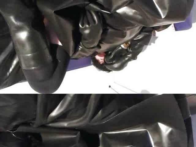 "rubberboot lover latex bessy wearing rubberapron bigdildo riding , boot and gasmask lover ,cum swallow"