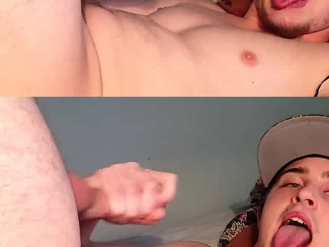 Twink friend strokes my big cock, I cum in his mouth