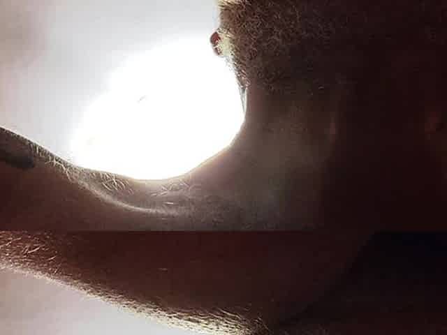 Sweaty chunky hairy bear jerks off his uncut fat cock
