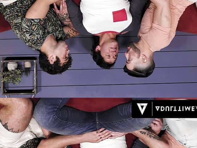 Interracial gay threesome on the red sofa with hot dudes