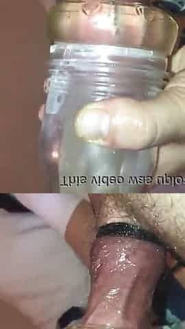 "Huge veiny cock being jerked with a flesh light for a huge cumshot"
