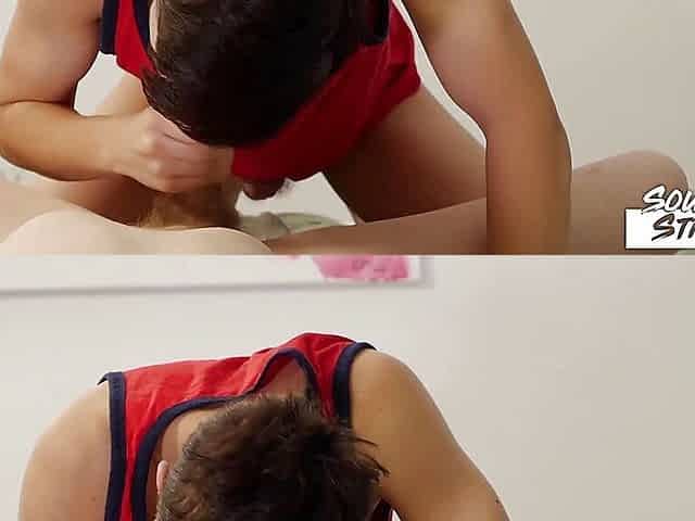 Naughty twink Matty makes blowjob to his young friend Aiden after oil massage