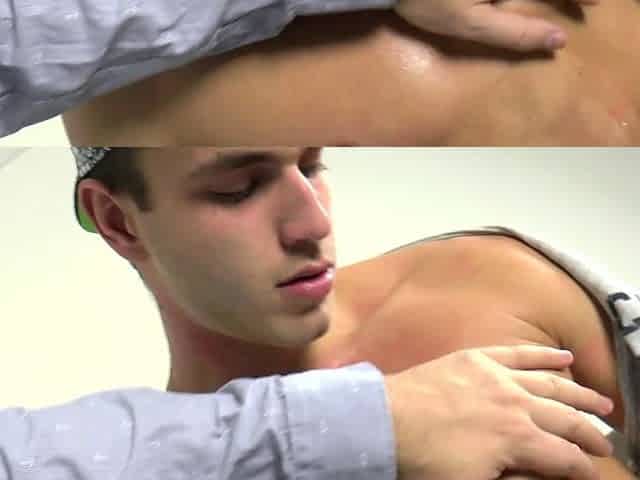 Muscular hot young stud on the verge of orgasm from a gentle cock massage