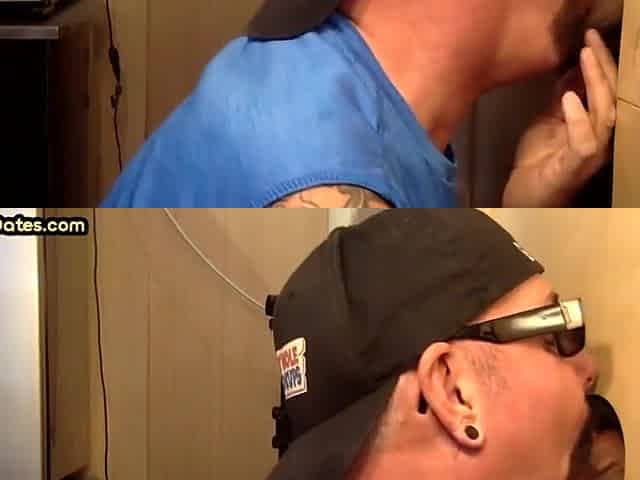 Gloryhole inked BJ mature gay sucks cock