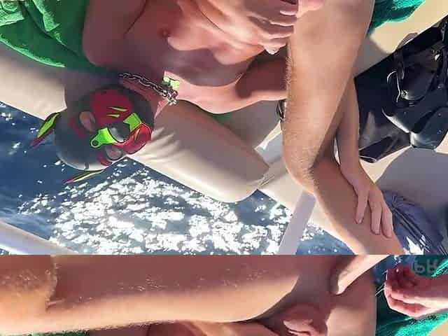 Sporty twink male gives a public oral sex to older gigantic weenie on the wild beach, til cum overflows