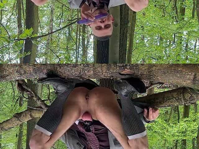 Suited Businessmen squirts milk from his malepussy and rides the sex tool in the forest untill getting an