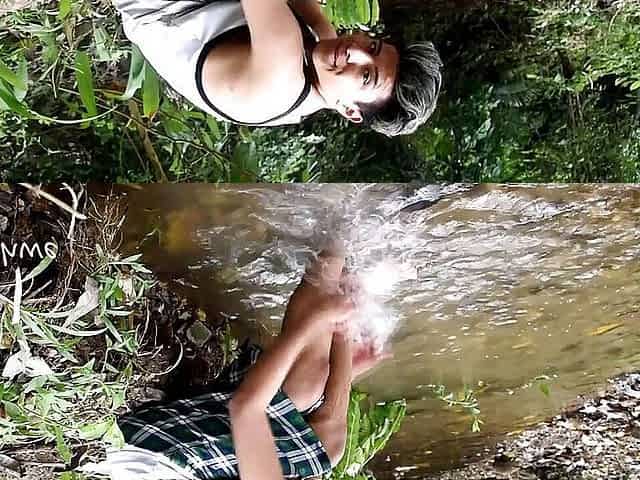 Russian village teen masturbates his big cock on the stairs and pisses outside