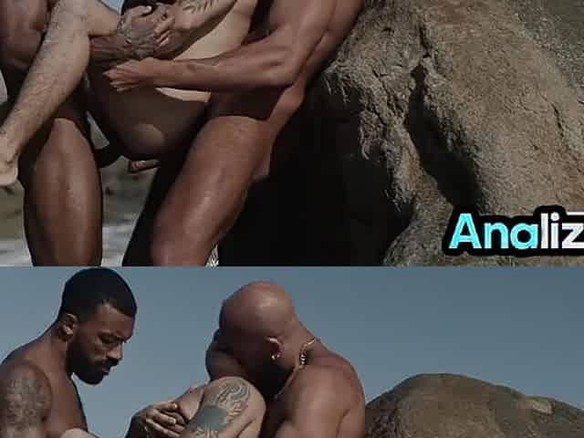 Bearded muscled dude doggyfucked in 3way