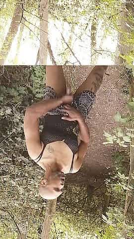 Ebony cum face BBC sissy wench guy outdoors in the woods wearing pants and petticoat and cums.