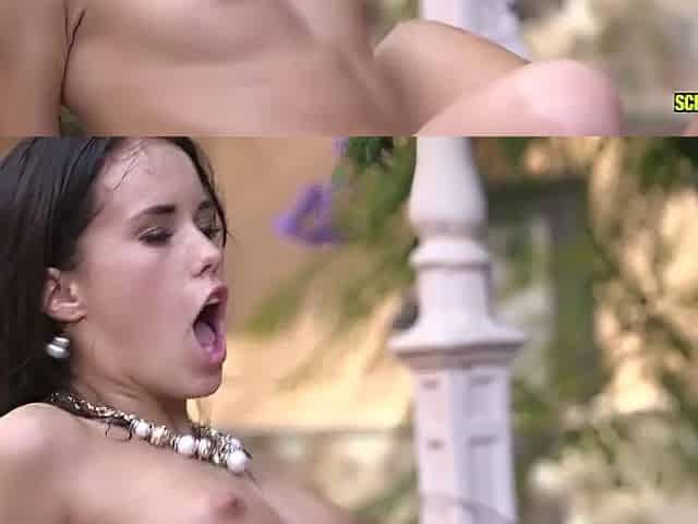 Naughty slim sexy teen Daisy toying herself outdoors