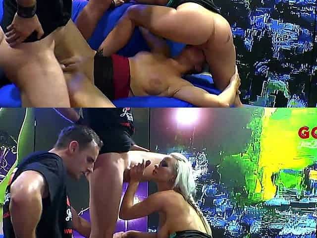 Blonde in latex fucked in an amateur threesome