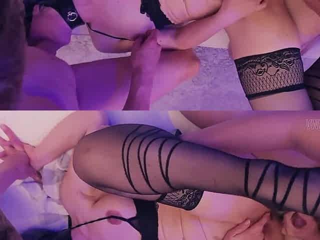Lacy Babe Double Teamed and Sucking Cocks Hard