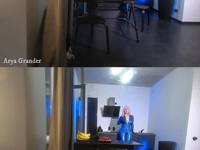 Curvy MILF in blue latex rubber catsuit, backstage camera