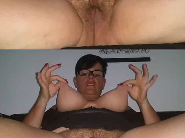 German slut masturbating hairy pussy and sucking her tits