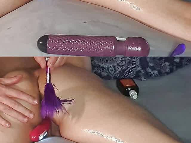 "tied up and oiled my wet pussy is being worked on "