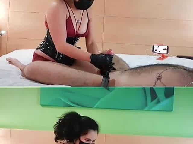 Mistress has fun with cock and balls and slave brings her to orgasm