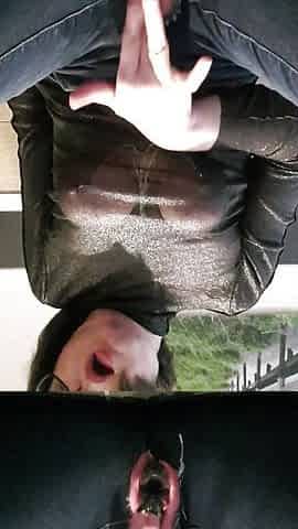 Julie has an orgasm in trousers with pussy out and little vaccum