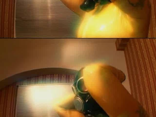 Gas mask fetish masturbation dildo penetrated in latex dress