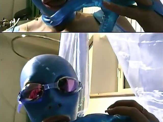 Krankenschwester in Latexuniform melkt Schwanz vom Patienten
