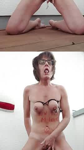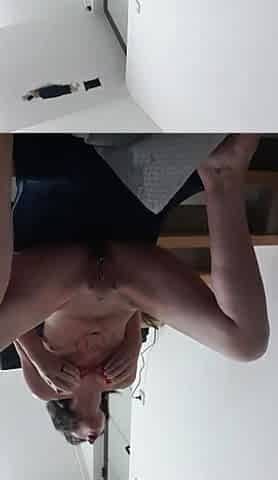 Crazy MILF nippleringlover masturbates while her pierced nipples are pulled and strapped to the ceiling