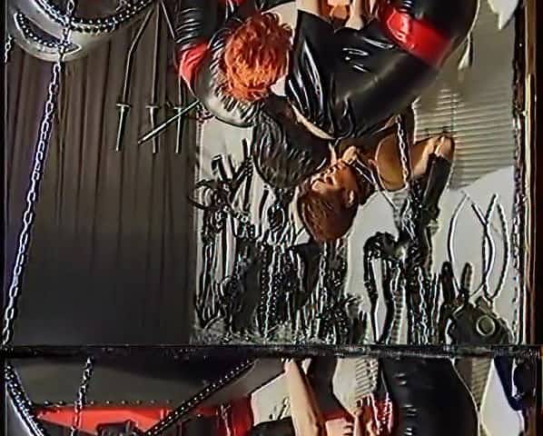 A vinyl dominatrix whips her slave