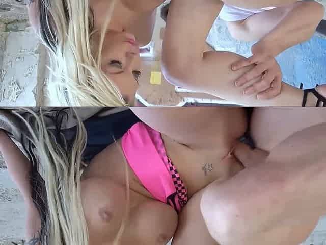 A Busty German Chick Pleasing Two Dudes in Public