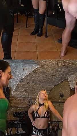 Lady Sadista und Helferin: Dominatrix anal fucks male slave
