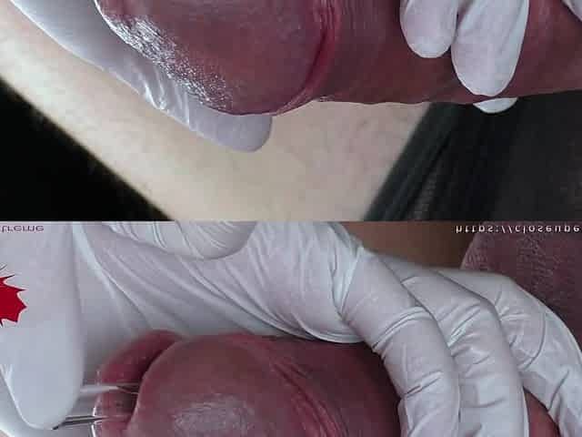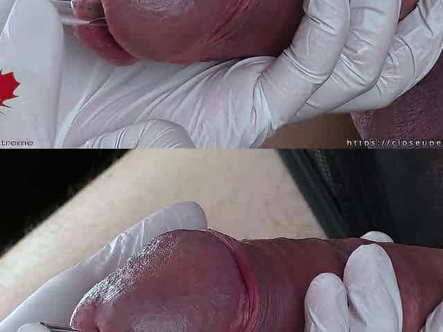 Flawless extraction of goo directly from the urethra. Close-up of the glass straw sounding.