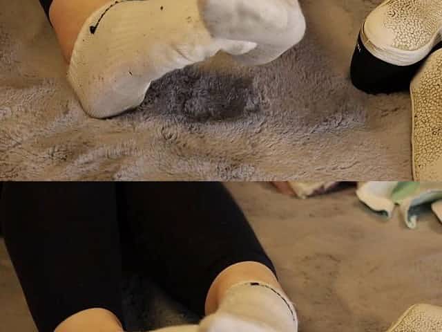 Kati spielt ihre verschwitzten Fila Turnschuhe und zeigt ihre stinkenden nassen grauen Stockings ver