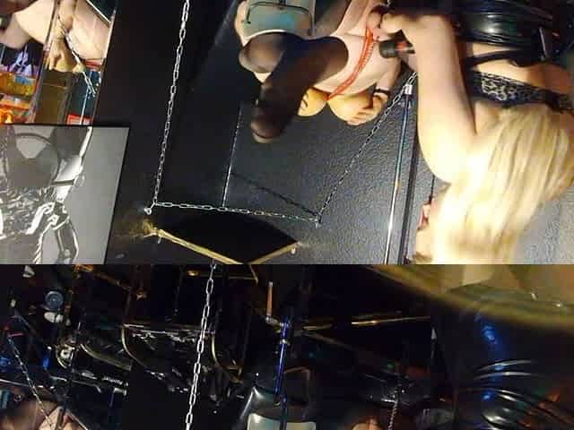 Girl in Hanging Bondage Gets Fucked and Fingered by 2 Femdoms