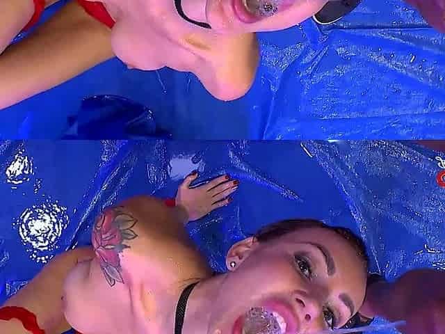 Close-up gangbang with deep throat action featuring busty amateurs
