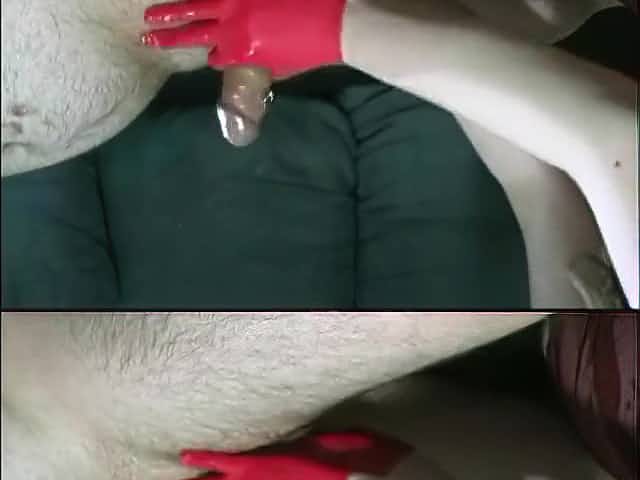 German BBW jerks guy in red latex gloves