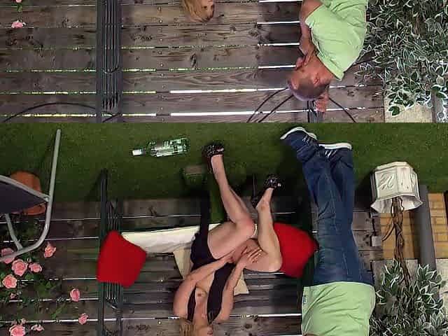 Ruthless threesome with two blondes showing off their wet pussies while bouncing their ample boobs in a German amateur scene
