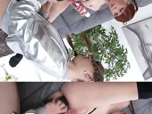Sexy blonde lesbian kissing pussy fucking threesome
