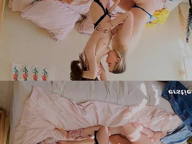 Sexy blonde lesbian kissing pussy fucking threesome