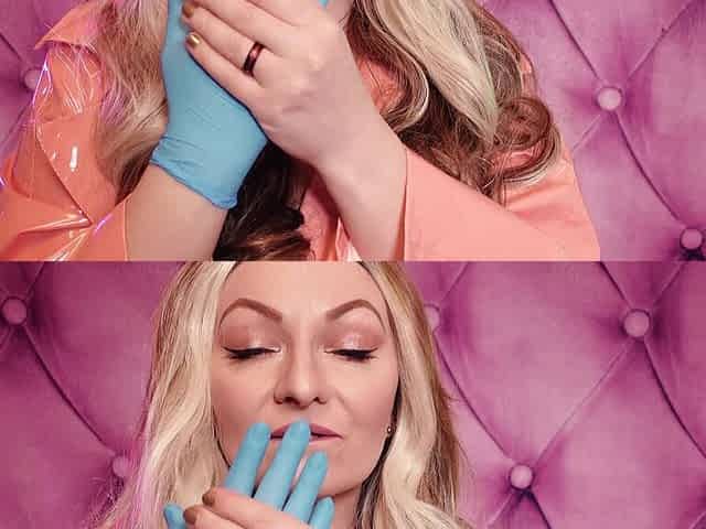 ASMR: blue nitrile gloves fetish - hot sounding - MILF in pink PVC coat (Arya Grander)