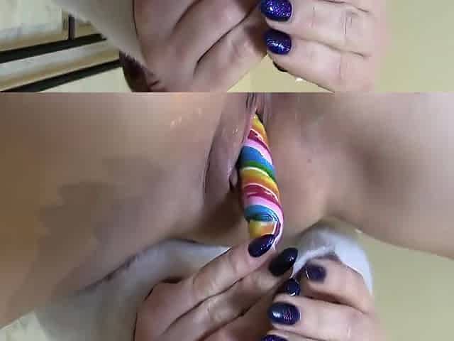 Reudige mother I'd like to fuck steckt sich Lolli in die Fotze