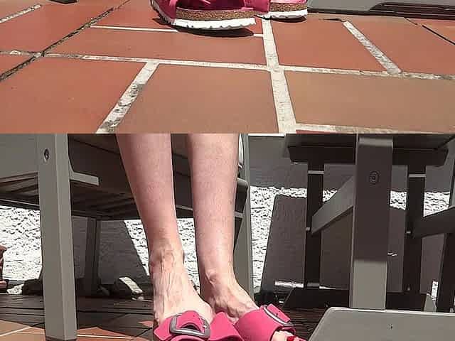 Shoe play, toe wiggling, wrinkled soles on the garden terrace