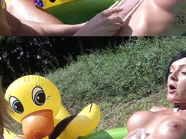 Two horny lesbians masturbate with toys outdoor by the pool
