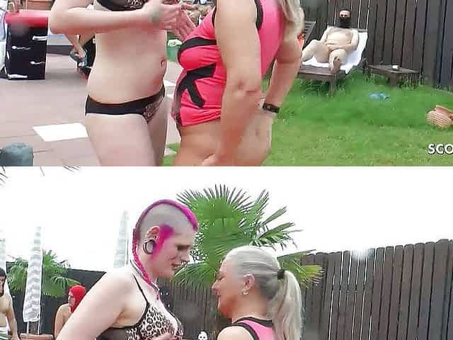 Outdoor ffm threesome on pool with two German teen babes