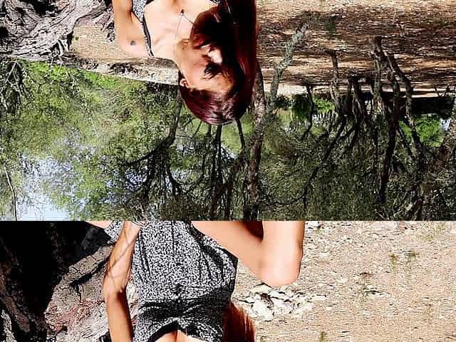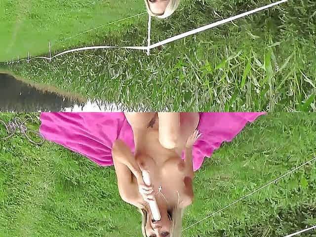 Short hair blonde bitch is fingering her wet pussy outdoors