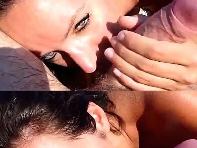 HeiBe Schlampe saugen zwei Schwanze im Freien