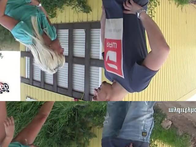 German stud is about to bang a lewd blond playgirl in a public place, during the day