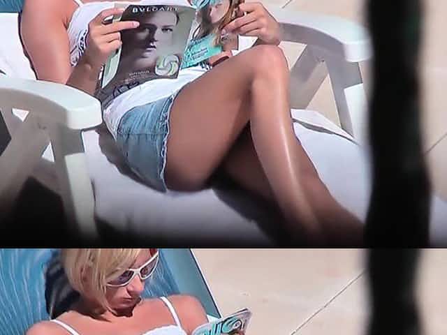 Busty blonde rubs her wet pussy outside, on her balcony.