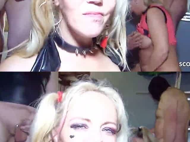 Sexy blonde teen masturbate pussy and fuck with two big dick men's