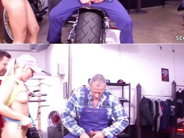 German motorcycle mechanics let horny blond customers compensate with a fuck
