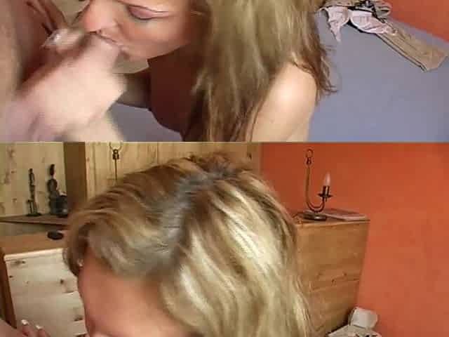 "A naughty blonde German babe pleasing two long peckers"