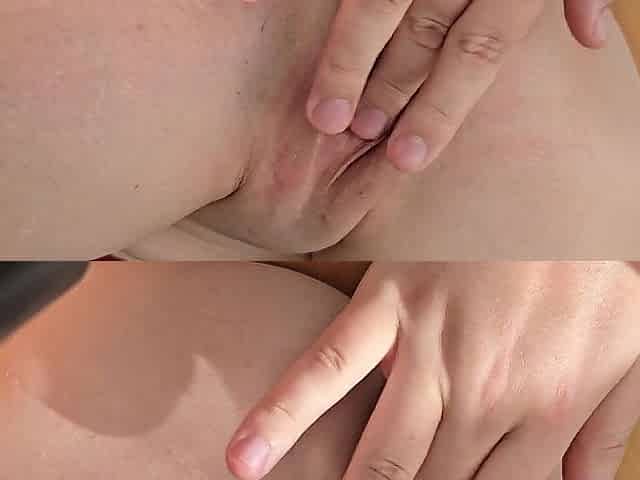 Skinny girlfriend Leyla Peachbloom plays with her shaved pussy