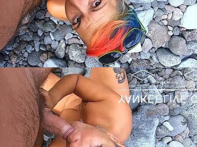 Short-haired tattooed girlfriend gives outdoor beach blowjob