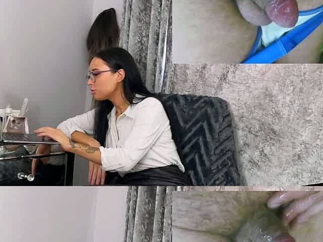 Watching his petite ramrod on the phone makes her lascivious